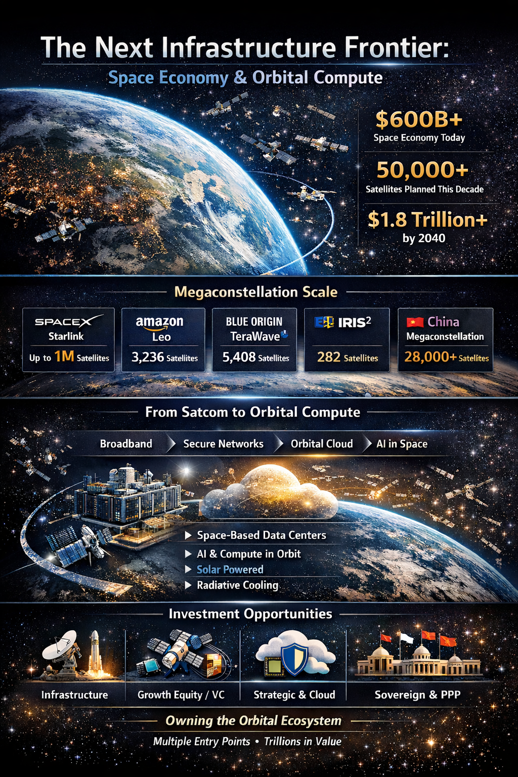 • Governments, hyperscalers, and private capital are simultaneously deploying tens of thousands of satellites.